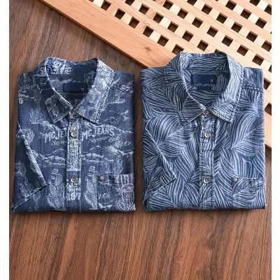 Men's summer distressed printed washed pure cotton denim short sleeved shirt