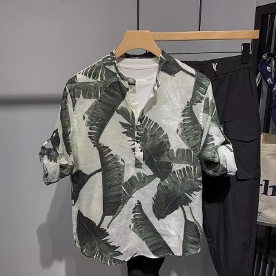 Summer men's light, thin, soft, and draped Cuban collar shirt