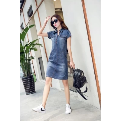 Summer New Korean Style Women's Clothing plus Size Short Sleeve Denim Dress Thin Elegant V Neck A- line One-Step Skirt Fashion