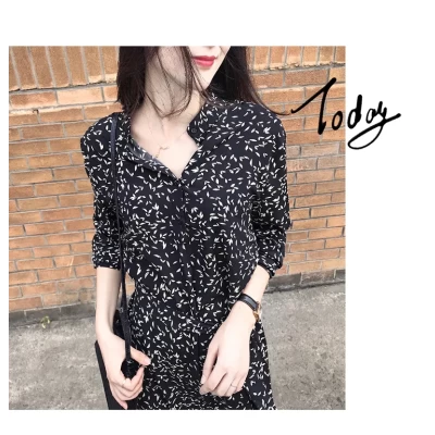 Autumn Korean-style Long Printed Chiffon Skirt Lace-up Floral Print V-neck Waist Hugging Slimming Long-sleeved Dress Knee