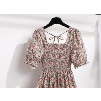 New summer A-line dress Short sleeve floral pleated boho women dress with back tie